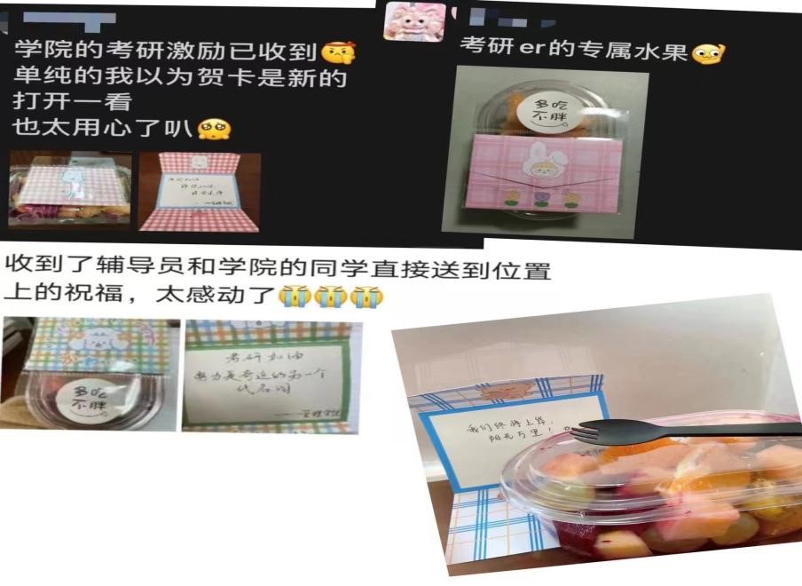 “我們終將上岸,陽光萬里。”“考研加油,錦程燦爛。”一句句溫馨祝福為考研學(xué)子們帶來一絲暖意。今日的“暖心水果”,為考研作準(zhǔn)備的學(xué)子們,暫時放下緊張的心情,投入到這溫馨的場景中,考研同學(xué)紛紛表示對此次的到訪感到十分驚喜,對于本次的水果他們也表達(dá)了深深的謝意。收到水果時,大家的臉上洋溢著笑容。