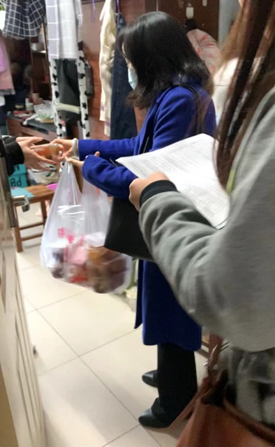 (圖為姚亞楠輔導(dǎo)員和毛忞歆老師向考研同學(xué)分發(fā)水果)