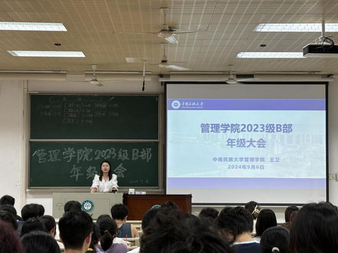 為幫助學(xué)生厘清學(xué)業(yè)規(guī)劃路徑和明確日常管理要求,9月6日下午,管理學(xué)院2023級(jí)B部于11棟100教室召開年級(jí)大會(huì),近240名學(xué)生參會(huì)。會(huì)議由2023級(jí)輔導(dǎo)員王衛(wèi)主持。