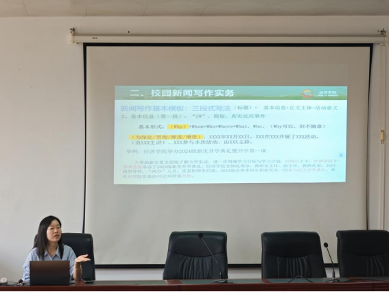 此次培訓(xùn)分為新聞寫(xiě)作培訓(xùn)和新聞攝影培訓(xùn)兩部分。王衛(wèi)通過(guò)列舉新聞稿件實(shí)例,引出5個(gè)“W”和1個(gè)“H”在一篇新聞稿中的標(biāo)題、導(dǎo)語(yǔ)、主體、結(jié)尾部分的妙用,深入淺出地講解了新聞寫(xiě)作目的、新聞要素、校園新聞寫(xiě)作實(shí)務(wù)三個(gè)方面。她表示,寫(xiě)好一篇新聞稿就如同烹飪,“要素”齊全才能色香味俱全。同時(shí),通過(guò)不同類(lèi)型的新聞稿案例展示,引導(dǎo)同學(xué)們知悉不同的新聞?dòng)^察角度、寫(xiě)作切入方式及不同類(lèi)別稿件寫(xiě)作技巧。