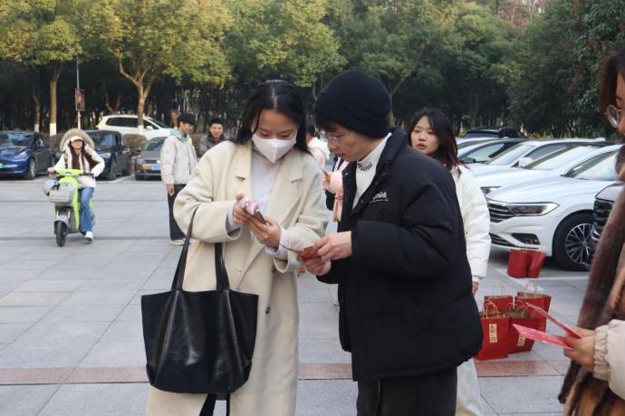當日中午,工作人員和志愿者們在5棟廣場集合,有條不紊地分裝禮包,布置活動現(xiàn)場。下午3點半活動開始,為確?,F(xiàn)場井然有序,志愿者們分列引導考研學生依編號領取禮包。禮包含學校食堂“上岸”套餐餐券2張、橙子2個、1瓶水以及蓋有“折桂”“上岸”“逢考必過”“管理學院”等篆書印章的書簽1枚。1瓶水代表“第一名”,2個橙子寓意“考研能成、心想事成”,組合成的數(shù)字“100”寓意“考滿分”,多枚印章由學院黨委副書記李明亮精心雕刻,“上岸”套餐餐券還單獨印上了學生的名字及祝福語,寓意學院時刻為考研學子護航?!八性⒁?,皆愿考研的學長學姐們在考研之路上一帆風順!”學院團委學生負責人劉翊昭然介紹道。