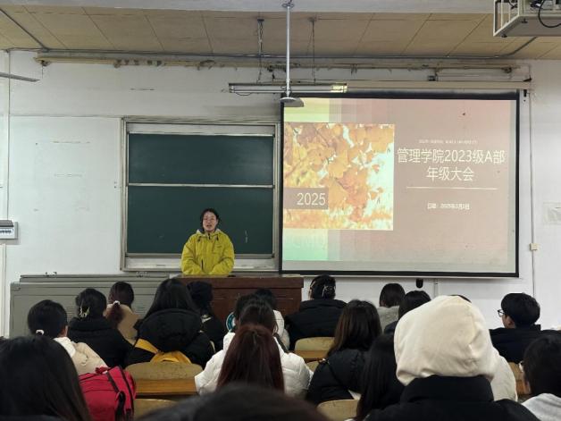 3月3日中午,管理學院2023級A部于1棟教學樓201教室召開年級大會,2023級A部全體學生參會。會議由輔導員李丹主持并主講。