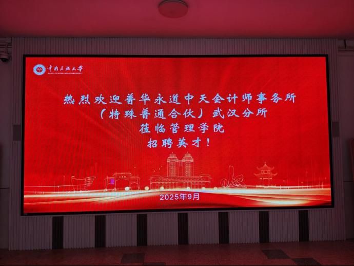 南湖秋水育棟梁,職場東風(fēng)送良機。9月23日下午,普華永道中天會計師事務(wù)所(特殊普通合伙)武漢分所應(yīng)邀在我院舉辦專場校園宣講會。宣講會由該所審計部經(jīng)理林靖欽主持,我院優(yōu)秀校友、現(xiàn)任職于該所的唐蛟、張智林返校分享。本次活動由我院會計系教師劉華統(tǒng)籌協(xié)助,為管院學(xué)子帶來了一場內(nèi)容翔實的職業(yè)發(fā)展指導(dǎo)課。