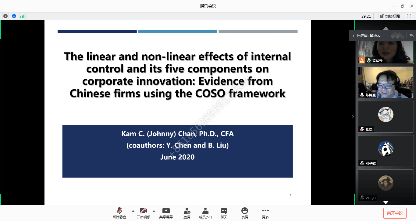 (文字記者:張瑞、王擎)2020年7月4日上午,應學校管理學院邀請,美國西肯基大學陳錦全(Johnny Chan)教授通過視頻會議為我院師生做了主題為“The Linear and Non-Linear Effects of Internal Control and its Five Components on Corporate Innovation: Evidence from Chinese Firms using the COSO framework”的學術講座。講座由管理學院副院長、翟華云教授主持,管理學院老師和研究生共70余人在線收聽和學習。