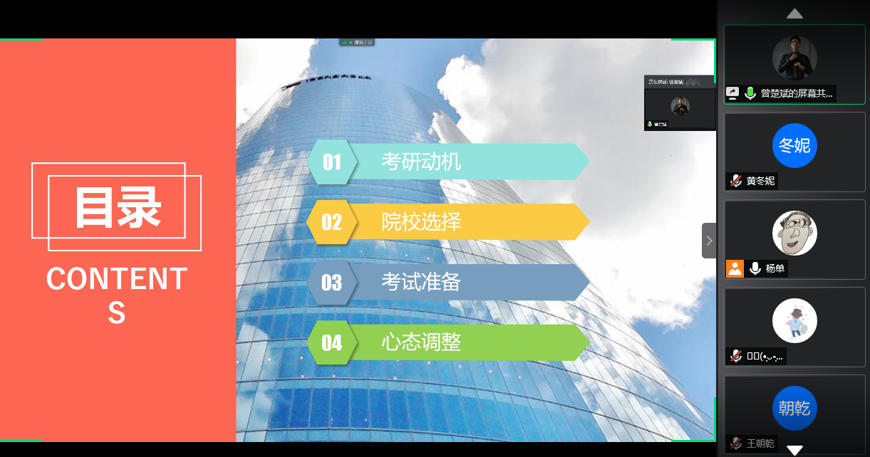 (文字:黃冬妮)6月12日,2017級信息管理與信息系統、大數據專業于騰訊會議召開考研經驗線上交流會。今年,2016級信管專業考研同學獲得喜人成績,7位學子如愿以償,考研成功。為加強16、17級考研學生的交流與聯系,指導17級考研同學科學備考,本次交流會特邀2016級楊雨璇(國防科技大學)、王超然(蘭州交通大學)、曾楚斌(華南師范大學)、周正伊(中國人民解放軍軍事科學院)四位師兄師姐講述自身經歷,交流切身體會,分享寶貴經驗。