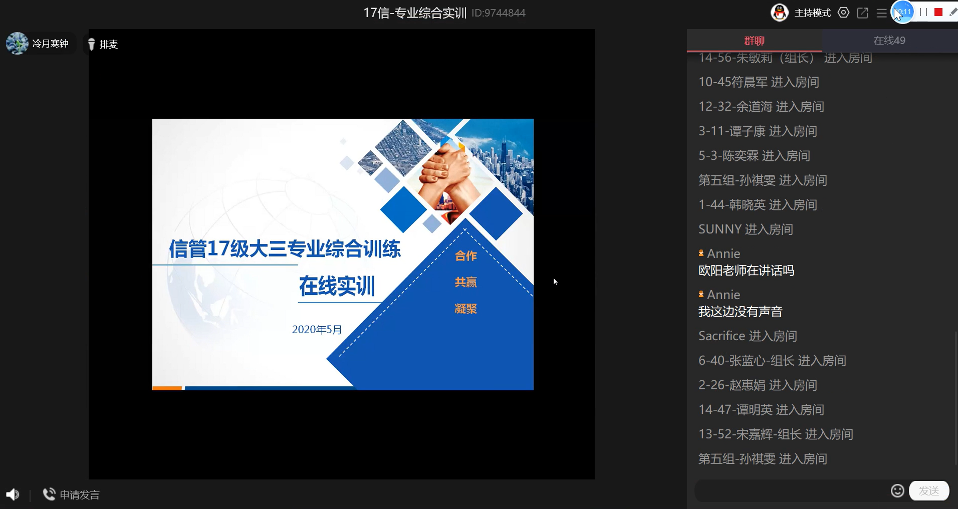 (文字記者:黃冬妮)為進一步提升信管專業(yè)同學(xué)的實踐能力,保證信管專業(yè)綜合實訓(xùn)順利開展,管理學(xué)院信息管理系與武漢凡諾軟件技術(shù)有限公司合作,于5月18日上午,以線上直播方式召開了2017級信管專業(yè)綜合實訓(xùn)啟動會議,參會人員有信息管理系全體老師、武漢凡諾軟件技術(shù)公司指導(dǎo)老師、2017級信管專業(yè)全體學(xué)生。