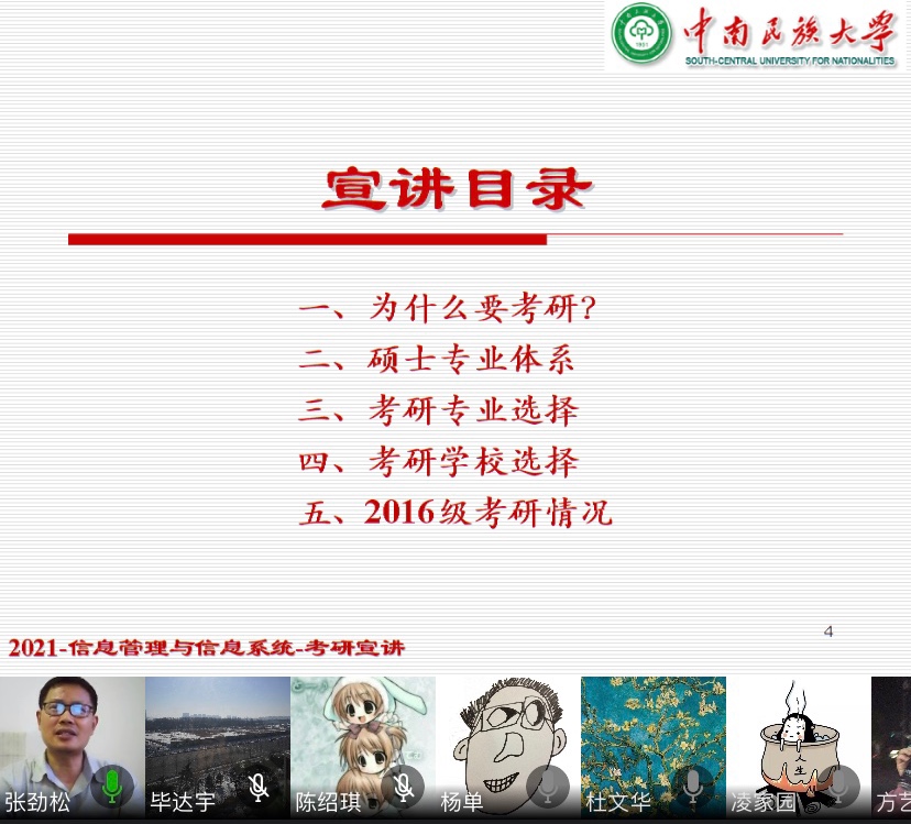 (文字記者:黃冬妮)為進一步做好疫情期間大三學生考研就業指導工作,5月22日,信管系召開了17級信管專業與17級大數據實驗班考研就業線上動員會。管理學院院長張勁松、黨委副書記雷長生、輔導員王宇娟、信管系全體教師以及17級信管專業和17級大數據實驗班全體同學參加會議。會議由信管系楊單老師主持。