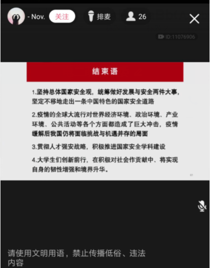 通過這次同上一堂課國家安全日活動,每位同學對這次疫情下的國家安全日有了更深的想,相信大家會時刻謹記維護國家安全的使命,為構建中華民族偉大復興中國夢安全保障盡一份力。