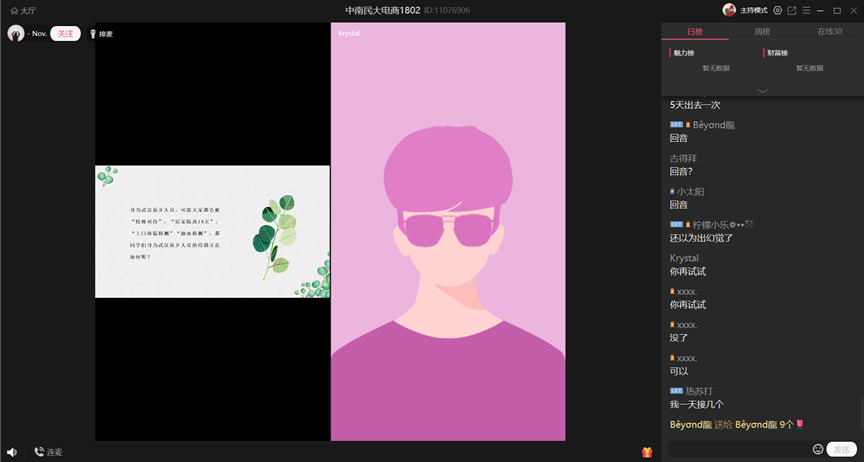 班會之前將導員拉進群與同學們一起互動交流。“假期分享”階段,在這個漫長的假期里,同學們都有很多話很多事想要分享,在家如何學習,安排作息等等內容,同學們都積極在群課堂下評論,或是采取連麥的方式,相互表達著思念。“網課感受”階段,導員連麥了解同學們的網課方式以及遇到的困難,并提出一些解決方法。