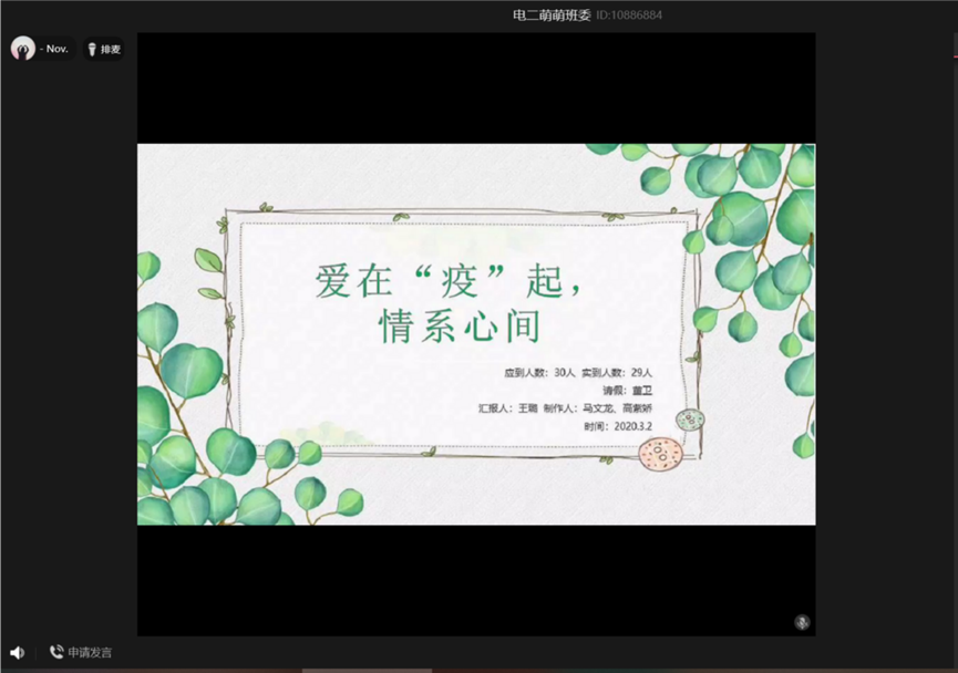 “豈曰無衣,與子同袍”在這場沒有硝煙的戰爭中,白衣戰士們奔赴前線,我們普通人更要守衛陣營。為此,2020年3月9日下午3時,我們電商二班除了有一名同學有事請假外,其他同學通過QQ直播的形式展開了一場“愛在‘疫’起,情系心間”的班級主題團會,牢牢抓住彼此的手,共同守衛我們的陣營。