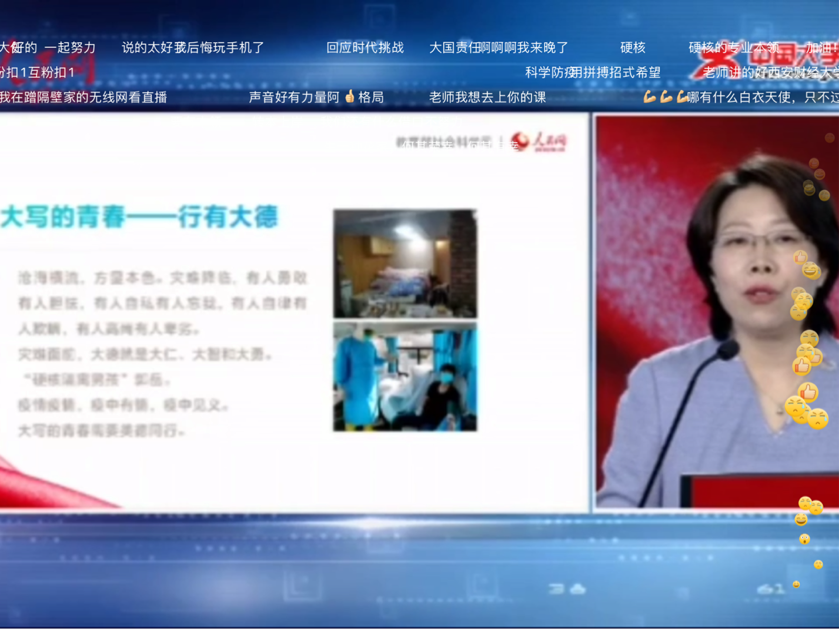 本次課程有四個(gè)部分,分別是,在抗擊疫情斗爭(zhēng)中深化理論認(rèn)知;疫情大考告訴我們什么;總結(jié)歷史經(jīng)驗(yàn),增強(qiáng)必勝信心;戰(zhàn)“疫”里最美青春--中國(guó)青年的責(zé)任與擔(dān)當(dāng)。其中最令大家感動(dòng)的,也是最后一個(gè)板塊。