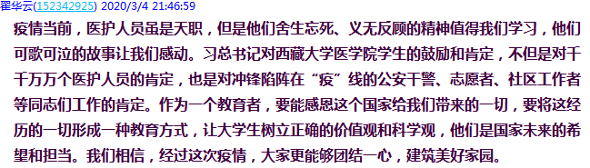近日,習(xí)近平總書記給在北京進(jìn)行實(shí)習(xí)的17名西藏大學(xué)醫(yī)學(xué)院學(xué)生的回信引起巨大反響。習(xí)近平總書記回信鼓舞人心、催人奮進(jìn),不僅體現(xiàn)了對奮戰(zhàn)在抗“疫”前線廣大醫(yī)務(wù)工作者的關(guān)懷與鼓勵(lì),也飽含了對青年學(xué)生成長成才的殷切期盼。為了深刻領(lǐng)會(huì)學(xué)習(xí)習(xí)總書記重要回信精神,會(huì)計(jì)系組織全體教研室老師集中在線學(xué)習(xí),提交學(xué)習(xí)心得,暢談學(xué)習(xí)感想。通過學(xué)習(xí),各位老師深受鼓舞,倍感教書育人使命感,紛紛表示一方面做好現(xiàn)階段線上教學(xué),充分利用現(xiàn)有平臺、各種軟件保證教學(xué)質(zhì)量;另外一方面將這次戰(zhàn)“疫”斗爭中表現(xiàn)出來的大愛融入人才培養(yǎng),緊緊圍繞省級“一流專業(yè)”建設(shè)機(jī)遇,為地方及民族地區(qū)培養(yǎng)勇于擔(dān)當(dāng)、本領(lǐng)過硬的時(shí)代新人: