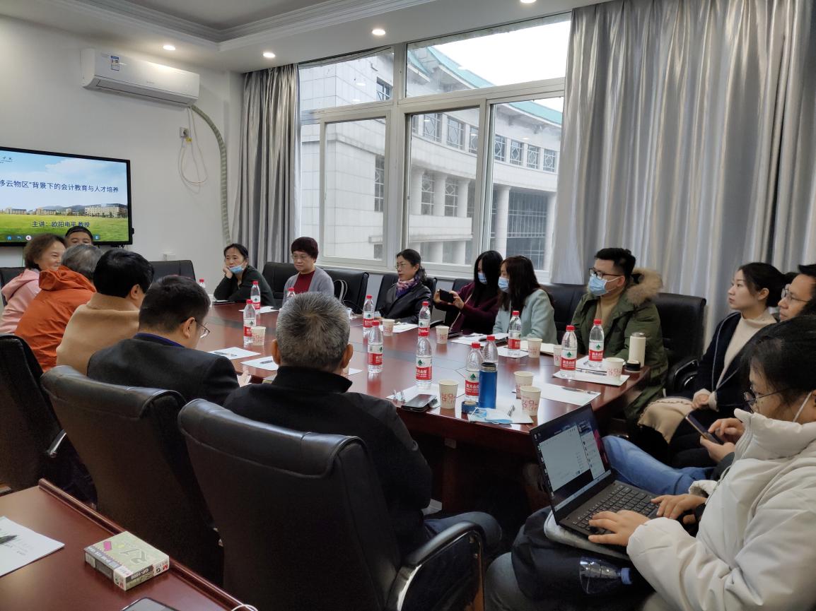 (文字作者:蔣寒悅)2020年11月21日上午,武漢大學(xué)教授、湖北省會計信息化專委會歐陽電平主任應(yīng)邀在5-319會議室作主題為《“大智移云物區(qū)”背景下的會計教育與人才培養(yǎng)》的學(xué)術(shù)交流,來自武漢大學(xué)、華中科技大學(xué)、中南財經(jīng)政法大學(xué)、華中師范大學(xué)、湖北經(jīng)濟學(xué)院等眾多武漢高校的湖北省會計信息化專委會委員和我院財務(wù)管理系部分師生近30人參會,交流會由財務(wù)管理系主任蘇亞民教授主持。 歐陽教授介紹了會計信息化的發(fā)展歷程,闡述了會計是如何從電算化走向智能化,分析了會計信息化的技術(shù)概念,歷數(shù)了會計第一代人工智能到第三代人工智能的變遷與進步。歐陽教授通過對其他高校智能會計專業(yè)建設(shè)的考察,提出各高校要根據(jù)不同的辦學(xué)層次進行差異化的智能會計教育,從目標(biāo)定位、專業(yè)特色、就業(yè)去向三點出發(fā),細(xì)化新時代背景下的會計人才培養(yǎng)思路。 最后,我院蘇亞民教授進行匯報發(fā)言,介紹了我校發(fā)展歷史和我院各專業(yè)特色,著重分享了智慧財務(wù)專業(yè)轉(zhuǎn)型、課程思政建設(shè)亮點以及財務(wù)共享實訓(xùn)基地的立項、建設(shè)和使用情況,會后,專家們興致勃勃前往16號教學(xué)樓財務(wù)共享實訓(xùn)實驗室進行實地參觀考察。