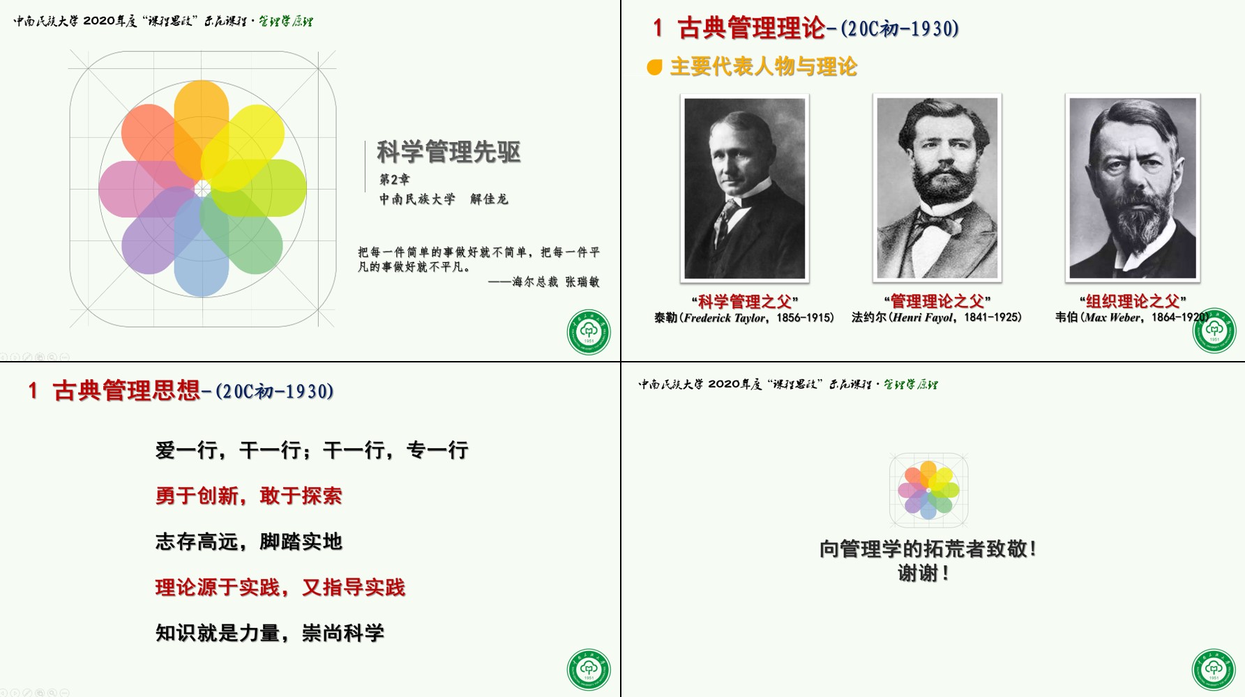 在簡要介紹了古典管理理論的時代背景后,播放了《摩登時代》的部分影視片段,透過蒙太奇式的藝術表現直觀了解了科學管理的現實價值,重點講解了泰勒、法約爾、韋伯三位管理學之父的人生履歷、實驗設計和學科貢獻,并從古典管理理論的艱辛開創過程中引導學生樹立正確的做人做事準則和堅持辯證唯物主義的世界觀與方法論。最后,通過向管理學的拓荒者致敬,再塑科學家為英雄的時代風標,培養學生千淘萬漉只為真的求實創新精神。