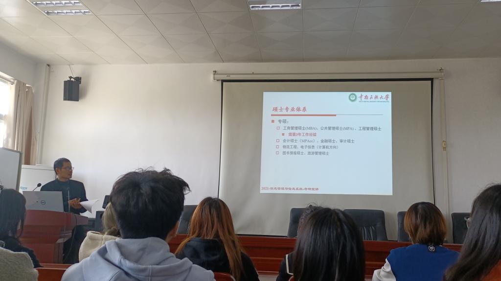 隨后,楊單老師對比了歷年來信管系學生考研、就業的數據,結合之前收集的18信管和大數據實驗班考研就業的問卷調查數據,從數據的角度對考研就業的基本情況作了詳細分析和說明,并向同學們提出了幾點建議,準備就業同學要做到“四個需要”:需要明確就業方向、需要鞏固課程理論知識、需要積極參與實習、需要務實專業技能;準備考研同學要做到“四個堅持”:堅持方向目標不動搖、堅持積極獲取外界信息、堅持充分利用各方資源、堅持與師長交流和溝通。