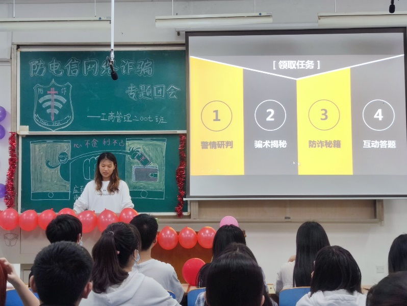 (文字記者:馬翔)2021年4月23日,管理學院2020級工商管理類的十二個班級在輔導員盧海濤的指導下開展主題為“提高防范意識,預防電信網絡詐騙”班團會,2020級A部各班同學都積極參與了班會并認真學習了“防電詐”的相關知識。