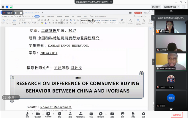 5月21日,中南民族大學管理學院2017級工商管理國際留學生順利進行了本科畢業論文答辯。答辯采用線上線下兩種方式同時進行,給在學校的5位留學生在5號樓310教室進行了線下答辯,給因為疫情影響不在學校的留學生進行了線上答辯。工商管理留學生們畢業論文主要對經濟管理領域的熱點問題進行了研究探索,論文主題包括中國企業與國外企業經濟管理與企業文化等的對比研究、中國企業管理經驗的探索以及中國企業界一些新型業態的發展探究等。