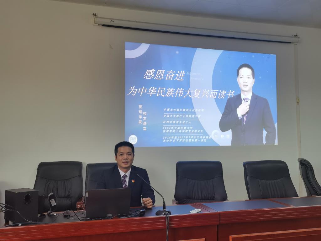 10月23日下午,管理學(xué)院邀請(qǐng)2003級(jí)工商管理專(zhuān)業(yè)校友葉映群為同學(xué)們做了一場(chǎng)“感恩前行、不負(fù)韶華”的主題講座。葉映群回憶了自己的大學(xué)學(xué)習(xí)生活,講述了畢業(yè)后的工作經(jīng)歷,認(rèn)為生之艱難,來(lái)之不易,更應(yīng)該感恩中國(guó)共產(chǎn)黨,感恩父母,感恩學(xué)校和老師,建議同學(xué)們珍惜大學(xué)時(shí)光,不斷提升自己,不忘初心,牢記使命,為中華民族偉大復(fù)興而努力讀書(shū)。管理學(xué)院2021級(jí)陸中茜同學(xué)認(rèn)為:學(xué)長(zhǎng)的講座對(duì)我們是一次很好的黨性教育、生命教育、校史校情教育,自己也要以學(xué)長(zhǎng)為榜樣,努力學(xué)習(xí)。葉映群校友工作于中國(guó)光大銀行,2018年至2021年在江西省瑞金市葉坪鄉(xiāng)下羅村任扶貧駐村第一書(shū)記,期間下羅村全體脫貧,葉坪鄉(xiāng)被評(píng)為全國(guó)扶貧攻堅(jiān)先進(jìn)集體,葉映群被評(píng)為江西省扶貧先進(jìn)個(gè)人,中國(guó)光大銀行十佳扶貧干部。