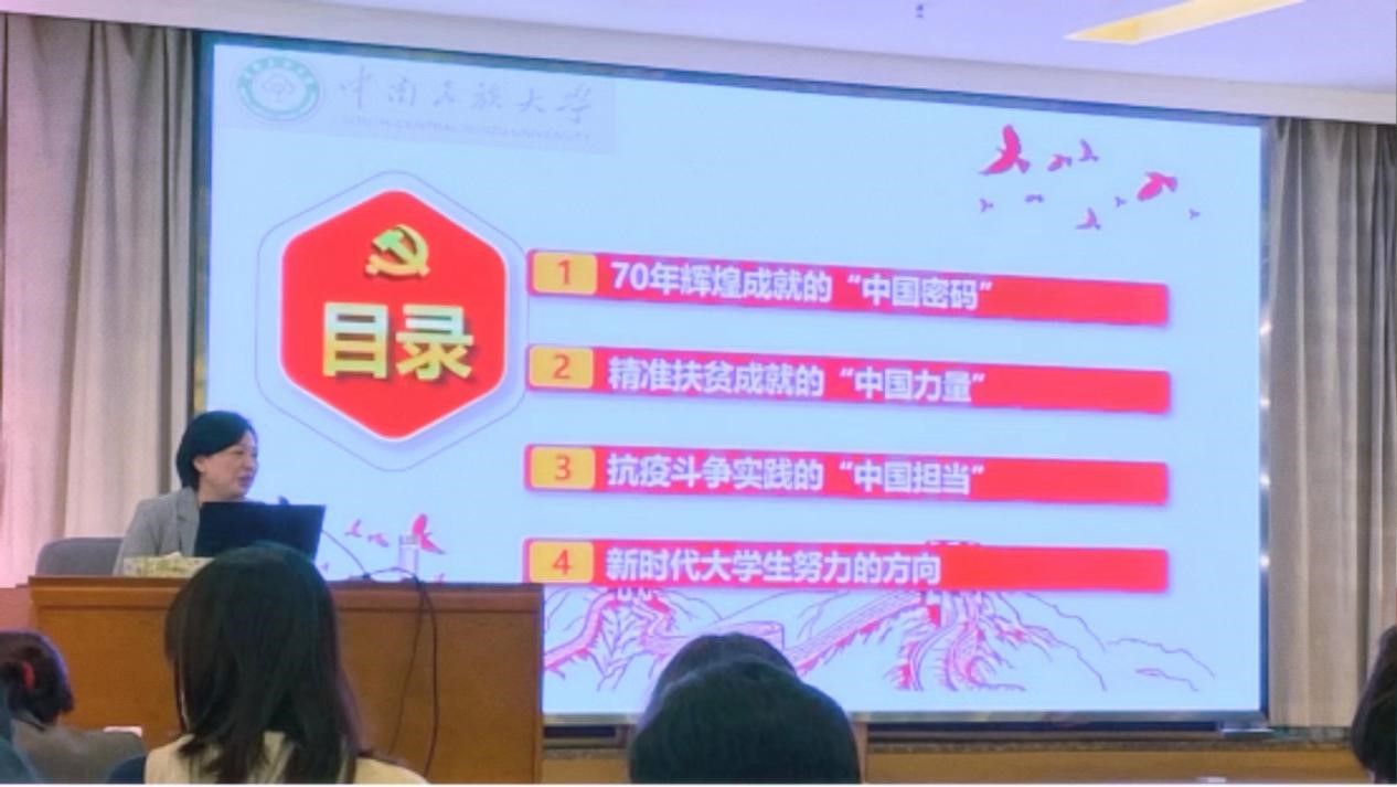蔡瓊結合個人豐富的工作經歷和人生閱歷,用大量的事實和簡潔的語言,從70年輝煌成就的“中國密碼”、精準扶貧成就的“中國力量”、抗疫斗爭實踐的“中國擔當”、新時代大學生努力的方向四個方面回顧了中國共產黨帶領中國人民從站起來到富起來再到強起來的過往,生動又具體地講述了中國共產黨在實現輝煌成就過程中的初心不改,帶領中國在經濟上從一窮二白發展成為世界第二大經濟體的過程;闡述了中國共產黨在帶領群眾精準扶貧過程中的堅定不移,使得現行貧困線下脫貧攻堅取得了舉世矚目的成就;回望了武漢疫情保衛戰中,在中國共產黨的領導下,武漢疫情取得了重大勝利,中南民族大學在學校黨委的領導下,成立了臨時黨支部,統一思想,統一意志,統一行動,毫不放松持續抓緊抓實抓細各項防控工作,始終把師生生命安全和身體健康放在第一位,堅決打贏疫情防控攻堅戰。同時,蔡老師結合習近平總書記在中國人民大學考察時的重要講話,希望同學們牢記習近平總書記對青年的囑托,聽黨話、跟黨走,用腳步丈量祖國大地,用眼睛發現中國精神,用耳朵傾聽人民呼聲,用內心感應時代脈搏。從悟初心到守初心,從組織上入黨到思想上入黨,無愧于我是一名光榮的中國共產黨黨員的稱號。