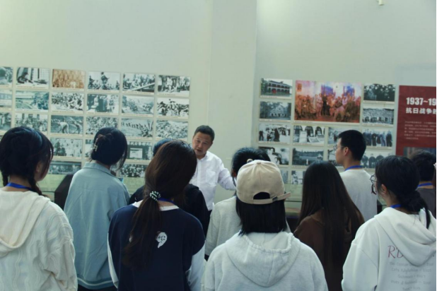 緊接著師生前往軍民抗戰博物館開展愛國主題教育活動,在萬館長帶領講解下,大家參觀了雕塑藝術館、黨史教育館、楚天將帥館、抗美援朝文物館、武漢會戰文物館。235名湖北籍將帥的資料、發黃的入黨志愿書、不同時期的共產黨宣言、銹跡斑斑的勛章……大量珍貴的文物生動展現了武漢會戰歷史和湖北各族軍民在抗戰中做出的卓越貢獻。同學們一邊駐足學習,一邊交流思想心得,進一步凝聚了生動的愛國主義思想共識。徐同學表示,“作為新時代青年,我們要銘記歷史,崇尚英雄,將紅色基因傳承下去,為實現中華民族偉大復興不懈奮斗。”最后,全體師生在館前合影留念。