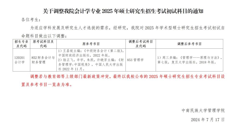 關于調整我院會計學專業2025年碩士研究生招生考試初試科目的通知