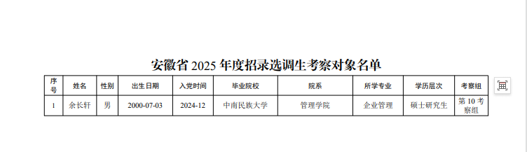 按照安徽省 2025 年度招錄選調生公告等規定,余長軒同志已被確定為安徽省 2025 年度招錄選調生考察對象,現 予公示。公示時間從 2025 年 5 月 28 日至 6 月 4 日。公示期 間,如對考察對象有意見,可通過電話、信函、電子郵件等 方式向安徽省委組織部干部隊伍建設規劃辦公室反映。