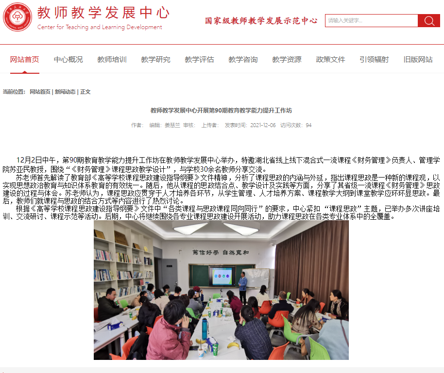 2021年12月2日中午,第90期教育教學能力提升工作坊在教師教學發展中心舉辦,特邀湖北省線上線下混合式一流課程《財務管理》負責人、管理學院蘇亞民教授,圍繞“《財務管理》課程思政教學設計”,與學校30余名教師分享交流。(教師教學發展中心開展第90期教育教學能力提升工作坊)