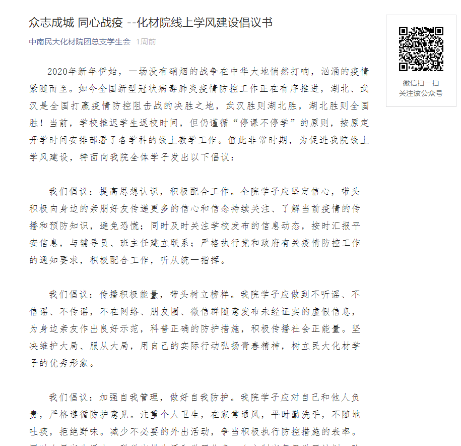 化學與材料科學學院發布《眾志成城同心戰疫——化材院線上學風建設倡議書》,倡議全院學生充分利用互聯網資源,增強自我學習意識,高質量完成學習任務,做好知識技能儲備。