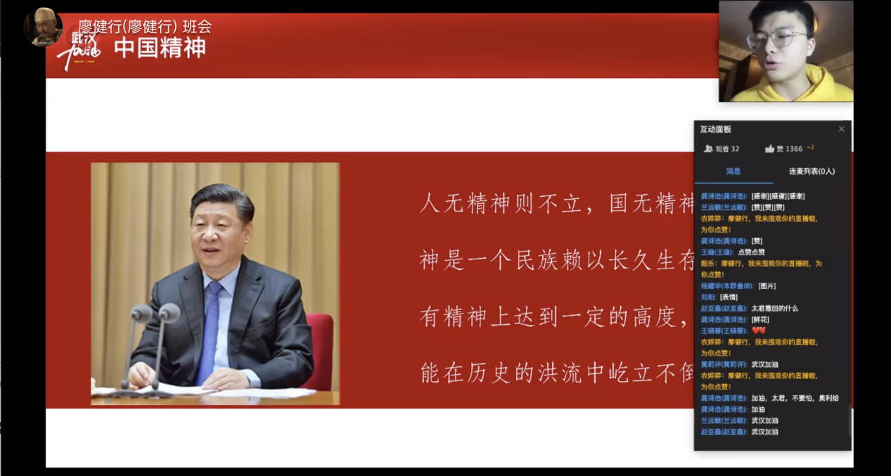 2020年2月16日是正式開學的前一天,計算機科學學院師生用線上“云”連上線下“情”。計算機1908班正使用“釘釘”平臺開展一堂生動的愛國主義主題班會,主題班會的內容是“用中國精神凝聚抗擊疫情的強大力量”,團支書廖建行同學帶領全班同學學習校團委發起的《致全體民大青年學生的倡議書》,結合中國精神在98年抗擊大洪水,03年抗擊非典,08年抗爭救災發揮的巨大作用,鼓勵全班同學在危難時刻始終與祖國同命運,與人民共患難,用中國精神凝聚起抗擊疫情的“民大力量”,用自己的實際行動展現一名愛國青年的責任擔當。