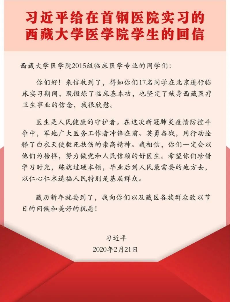 在藏歷新年來臨之際,中共中央總書記、國家主席、中央軍委主席習近平2月21日給正在北京大學首鋼醫院實習的西藏大學醫學院學生回信,肯定他們獻身西藏醫療衛生事業的志向,勉勵他們練就過硬本領、服務基層人民,在全國高校引起了熱烈反響。我校師生以多種形式深入學習習近平總書記重要回信精神。