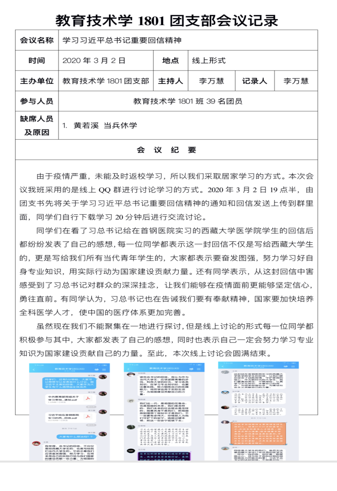 教育學院班級團會會議記錄。 來源:教育學院 教育學院2017級的同學們,迎來了較為重要的一年。這一年,他們將面臨考研或就業的重要抉擇。疫情當前,同學們雖不能回到學校開始緊張的學習生活,但也同樣在家不斷的汲取知識,提升自己。在學習習近平總書記重要回信精神的過程中,同學們都深切感受到了習近平總書記對廣大基層人民群眾的深情掛念,同學們表示在將來的生活中認真貫徹落實習近平總書記重要回信精神,作為教育學專業的學生,雖然我們無法奔赴前線,但我們能夠通過學習疫情相關知識,向家人科普,做好防護措施。 教育學院2018級的學生們,是教育學院“第一批”以大類招生的方式招進來的學子。今年大二的他們重組了團支部,在團支書的組織帶領下,同樣進行了對習近平總書記重要回信精神的積極學習。他們表示,習近平總書記的回信,不僅僅是對他們的勉勵,也是對少數民族群眾的關心,更是對全體醫護人員醫學、教育者和醫學生親切關注和高度重視。在這種特殊時期,普通學生也應該堅持自己學習的本心,即使沒有正常的上課條件,也不能因此學業荒于嬉,思想毀于隨。這一戰,我們一定能贏! 教育學院2019級的同學們,在去年剛剛脫去稚嫩,步入了大學校門。這一次在學習習近平總書記重要回信精神的過程中表示,“哪里需要我們,我們就要到哪里去”。從事少數民族事業是來自少數民族地區的自己所要在事業方面思考到的第一點。處在教育學院的自己,更應該為少數民族教育事業做貢獻,為實現少數民族地區的富強與興旺,知識是必備的武裝,21世紀的新青年們,更應該具備一些基礎知識。習近平總書記給在首鋼醫院實習的西藏大學醫學院重要回信精神之中,大學生服務于少數民族地區是大家的使命,能夠讓每一個大學生、中國人擰成一股繩,團結一致向著中國的美好前進。同學們通過線上討論的方式發表了自己的學習感悟。 (來源:生命科學學院 音樂舞蹈學院 公共管理學院 管理學院 教育學院 編輯:梁瀟瀟)
