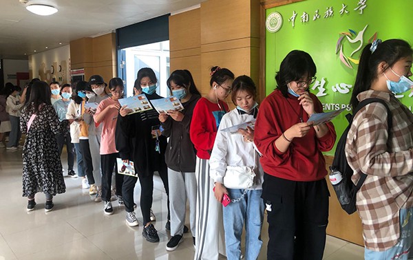 我校舉辦世界精神衛生日系列主題活動 張卓 攝 今年的精神衛生日主題活動主要分為新生參訪心理中心和線上線下主題宣傳兩部分。6000余名新生以班級為單位分批有序參觀了我校大學生心理健康教育中心。新同學在中心助理的引導下,依次參觀了民族音樂解壓室、朋輩輔導室、沙盤模型室、放松訓練室、團體活動室、情緒宣泄室、案例分析培訓室、預約接待室和心理咨詢室等房間,了解了心理健康教育中心咨詢師的概況以及預約心理咨詢的詳細流程。部分同學現場體驗了音樂放松椅等設備。中心還為同學們準備了精美書簽。