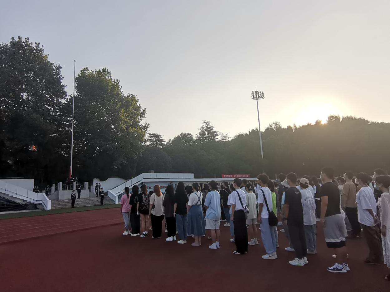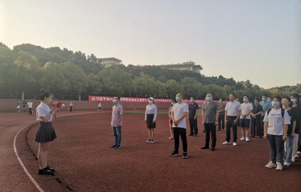 上午7時,升旗儀式正式開始,護旗手邁著鏗鏘有力的步伐,護送鮮艷的五星紅旗,昂首走向南湖體育場升旗臺。伴隨著莊嚴的《中華人民共和國國歌》音樂響起,全體師生集體向國旗行注目禮,同唱國歌。