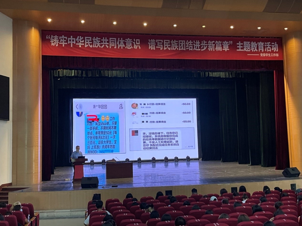 陶警官根據(jù)當前國家安全新形勢,緊密結合校園學習生活實際,以自身多年的從警經(jīng)驗,為在場全體師生做了一場國家安全、社會和諧、校園穩(wěn)定、學生平安等方面的講座。從防范電信網(wǎng)絡詐騙、非法校園貸、禁毒等內容為切入,通過數(shù)據(jù)、案例、視頻等形式深度剖析了大學生所面臨的潛在安全隱患,幫助大學生增強了安全防范意識,引導學生樹立正確的國家安全觀。黨委學生工作部艾力亞老師緊緊圍繞“新時代我國政治安全與大學生日常學習生活”主題,結合自身工作經(jīng)驗以及生動案例,從歷史問題、國內外形勢、當前局勢等方面講解了政治安全的重要性。