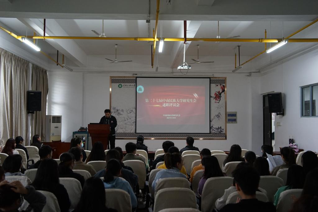 主持人介紹會議流程后,中南民族大學第二十七屆研究生會主席團成員及各部門主要負責人代表依次從成員情況、工作成效、紀律作風、改革建議、未來展望等方面對過去一年的工作展開述職匯報,評議人員從政治態度、道德品行、學習情況、工作成效、紀律作風五個方面對述職人員進行全方面綜合評價。