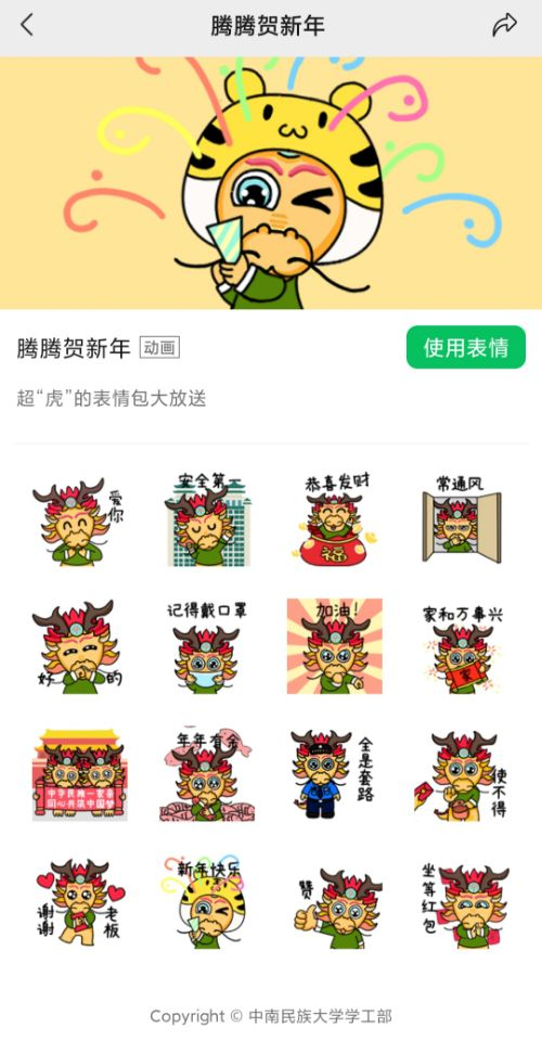 “‘騰騰’賀新年”表情包涵蓋理想信念教育、新春祝福、疫情防控、反電詐、日常生活等諸多方面,寓教于樂,展示了民大人昂揚奮進、逐夢前行的精神風貌。農歷新年將至,“騰騰”與民大人一起共迎新春,祝愿大家新春快樂、吉祥安康、虎氣沖天。