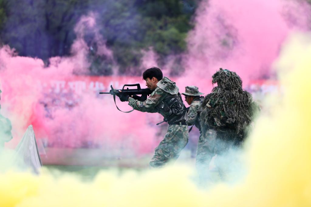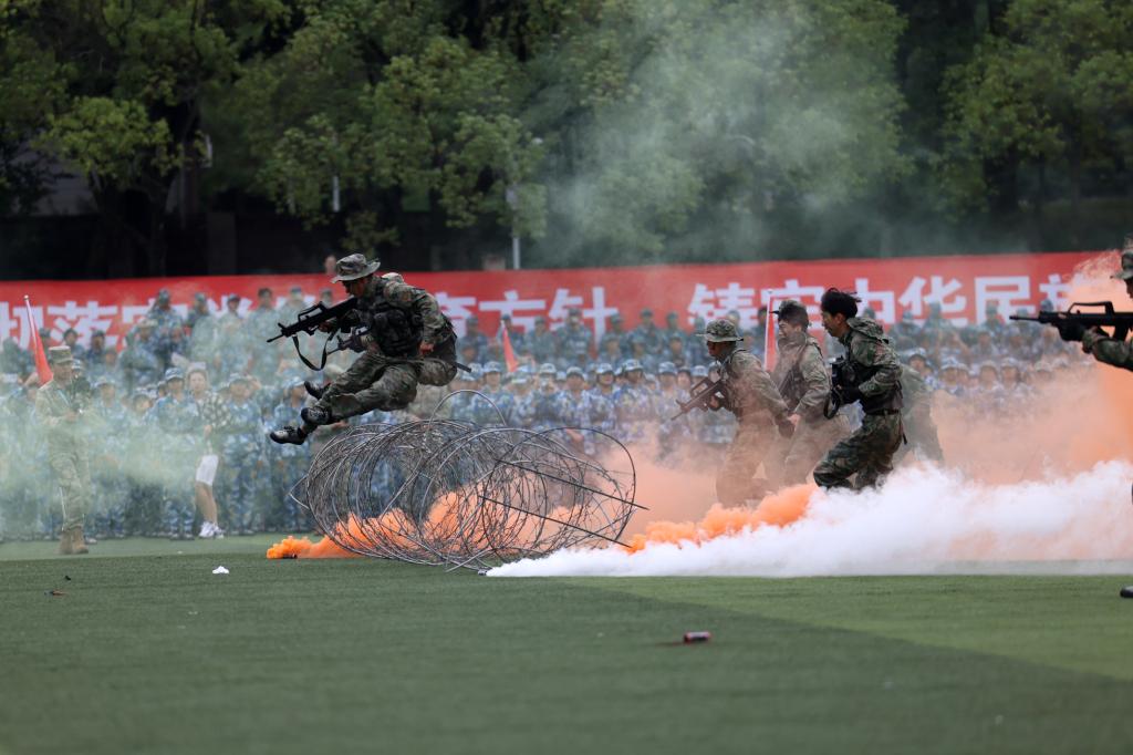 大會在莊嚴的國歌聲中拉開序幕,隨后在陸軍工程大學軍械士官學校軍訓團團長劉臣同志的指揮下,21個學生方陣以分列式形式依次通過主席臺。受閱方陣的學生步伐一致、動作規范、目光堅定,展現出了中南民族大學學子的颯爽英姿。隨后,花樣方陣、匕首操、格斗術、刺殺操、奪控要點科目展示等五個節目表演依次有序進行,參與節目表演的每位2023級同學朝氣蓬勃,昂揚向上,在精彩振奮的節目表演中展現出了自己的熱血青春,用實際行動展現了民大學子良好的精神風貌,書寫了自己的青春輝煌。