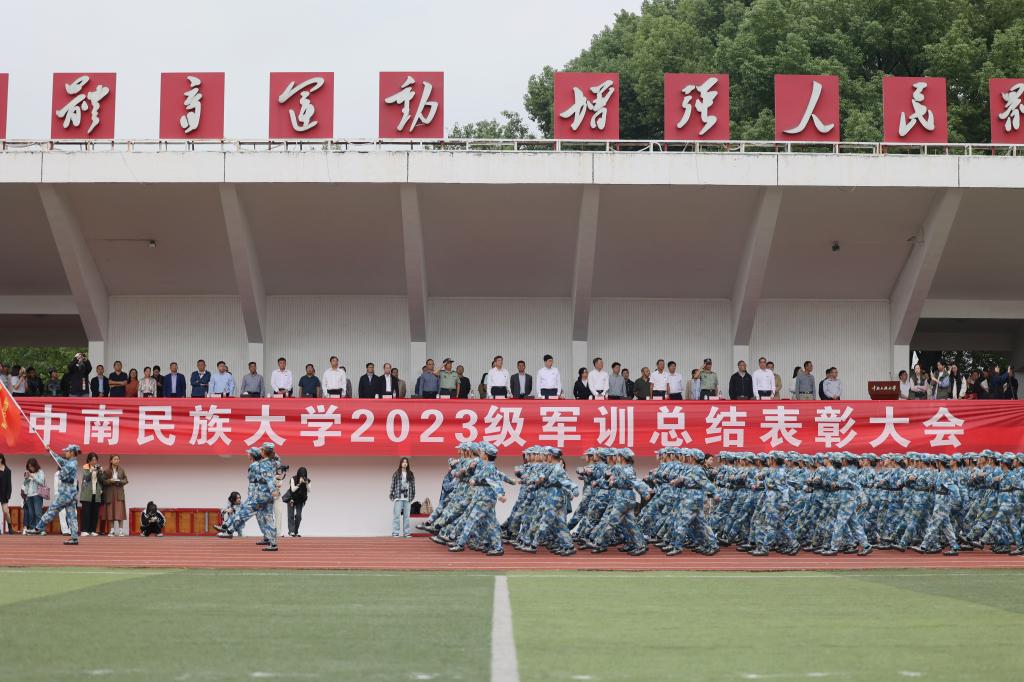 軍訓匯演結束之后,校黨委副書記、副校長白江源宣讀了《中南民族大學2023級本科生軍訓工作先進單位及先進個人表彰決定》。主席臺領導先后為軍訓中獲得16個單位“優秀連隊”、43名“優秀教官”、9名“優秀指導員”、5人“優秀助訓教管”、320名“優秀學員”頒獎。隨后,軍械士官學校副校長程志勇作軍訓工作交流發言,中南民族大學校長李金林向軍訓團贈送軍訓紀念錦旗。