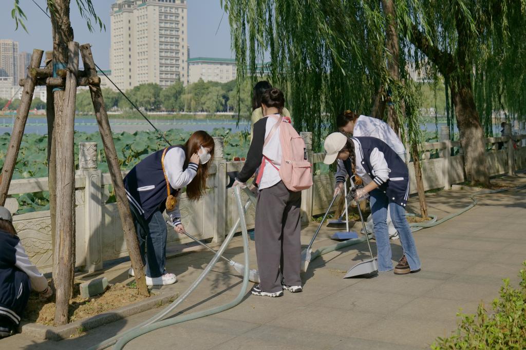 經過3個小時的環湖清掃工作,到下午五點,綠化帶及路邊的各種生活垃圾已被同學們清理干凈。經過訓練營成員們的共同努力,南湖畔重現粼粼水光、依依垂柳的美景。