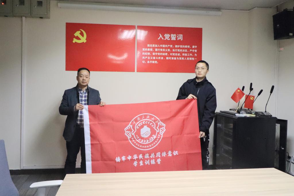 會上,潘宏飛代表黨委學生工作部為鑄牢中華民族共同體意識學生訓練營授旗。
