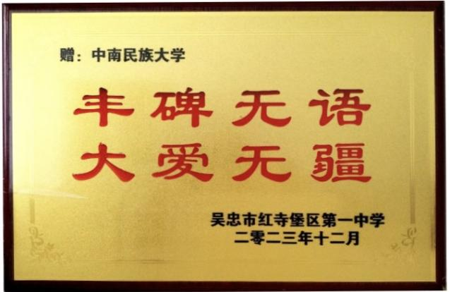 吳忠市紅寺堡區第一中學的感謝牌匾。