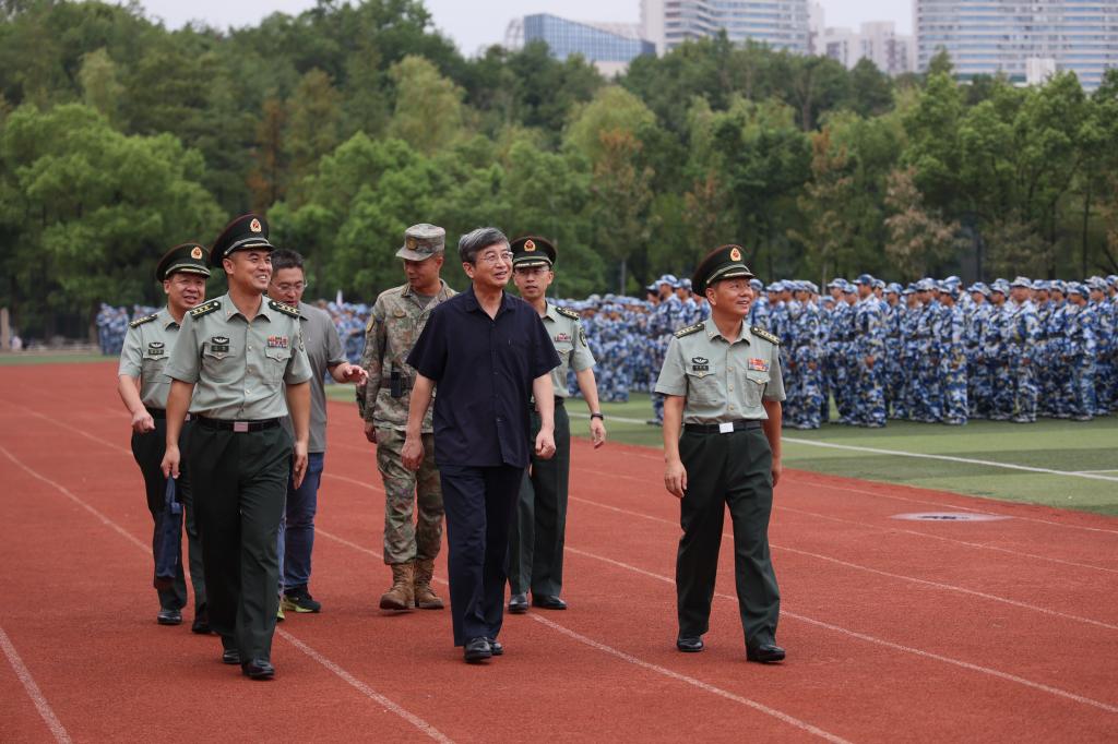 隨后,雙方校領導來到南湖操場軍訓場地,逐一檢查指導各營隊列訓練情況。檢查過程中,所有軍訓方陣暫停訓練,軍訓學生們以莊嚴軍姿肅立,接受領導檢閱,現場教官跑步報告情況。軍訓學生在雙方校領導穿過訓練營時齊聲吶喊:“首長好!”他們的行動整齊劃一,口號氣勢磅礴,彰顯出新生們勤奮進取的精神風貌,贏得了在場所有領導的一致贊譽。