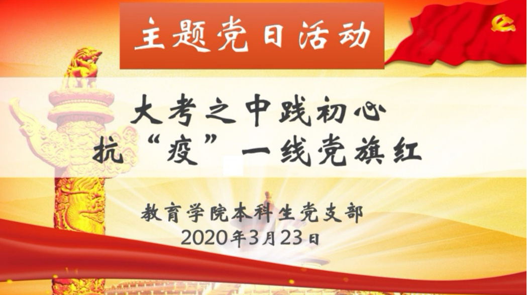 “大考之中踐初心,抗疫一線黨旗紅”。值此抗疫關鍵時期,共產黨員在這場戰斗中展現出的精神氣概為人民群眾所頌揚。這個階段,也是大學生“停課不停學”、畢業求職、考研復試的關鍵階段,為了更好地了解黨員們在疫情期間學習和生活情況,教育學院于3月23日晚在線上召開了本科生黨員會議。教育學院黨委副書記孫冰老師、教育學院本科生黨支部書記王之老師和教育學院本科生全體共產黨員參加會議。會議由王之老師主持。 結合疫情逐漸好轉的態勢,王之老師和與會的各位黨員同學分享自己的學習生活。
