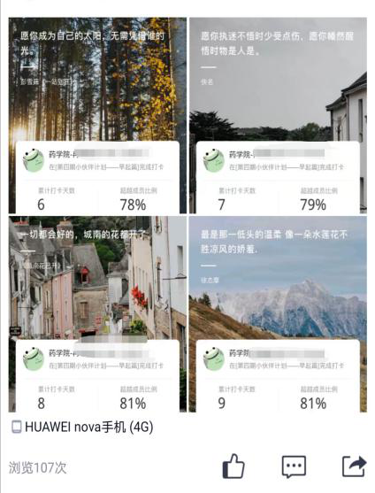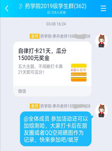 李丹老師開展工作和學生積極參與打卡活動的記錄。 召開“云班會”,增強自主學習意識 在輔導員、班主任、班助的帶領下,藥學院2019級各班召開新學期線上會議。會上共同學習疫情期間線上教學的相關說明,討論如何更好地進行線上學習,提出線上學習應提高自身重視,做好新學期規劃,鼓勵同學們利用好網絡資源和現有條件,希望同學們線上學習與線下學習一樣,及時完成任課教師布置的各項學習內容。 開展“云預警”,剖析原因精準施策 年級輔導員李丹老師整理學生上學期學業情況,摸排學習掛科學生,通過QQ、微信等渠道逐一聯系,幫助學生分析學業掛科原因,端正學習態度,改進學習方法,督促學生制定學習計劃,確保從源頭上幫助學生解決學業問題。 家校“云聯系”,形成合力協同育人 輔導員李丹老師與家長通過建立一對一微信關系、微信群、QQ群等方式,搭建家校平臺。通過反饋學生成績、日常表現等情況,讓家長及時、準確地了解學生情況。告知家長學校及學院在疫情期間的相關管理規定和對學生網課學習的相關幫扶措施,希望家長提高重視,參與對學生的學習管理工作,做好學生線上學習的督促和關注,配合學校引導學生努力學習,積極協助學院,以達到學院與家庭相互監管的目的。 組織“云打卡”,相互監督共同進步 李丹老師組織2019級學生參加校學業發展中心“小伙伴計劃”活動,并鼓勵同學們將打卡曬到QQ空間或朋友圈里,從而起到相互監督?;ハ嗉畹淖饔?。同學們紛紛在早起篇、外語篇、文體篇、日記篇、閱讀篇中打卡,在活動中提升線上學習的自覺性、積極性,培養良好的學習習慣。 (來源:藥學院 編輯:梁瀟瀟) invisible invisible invisible