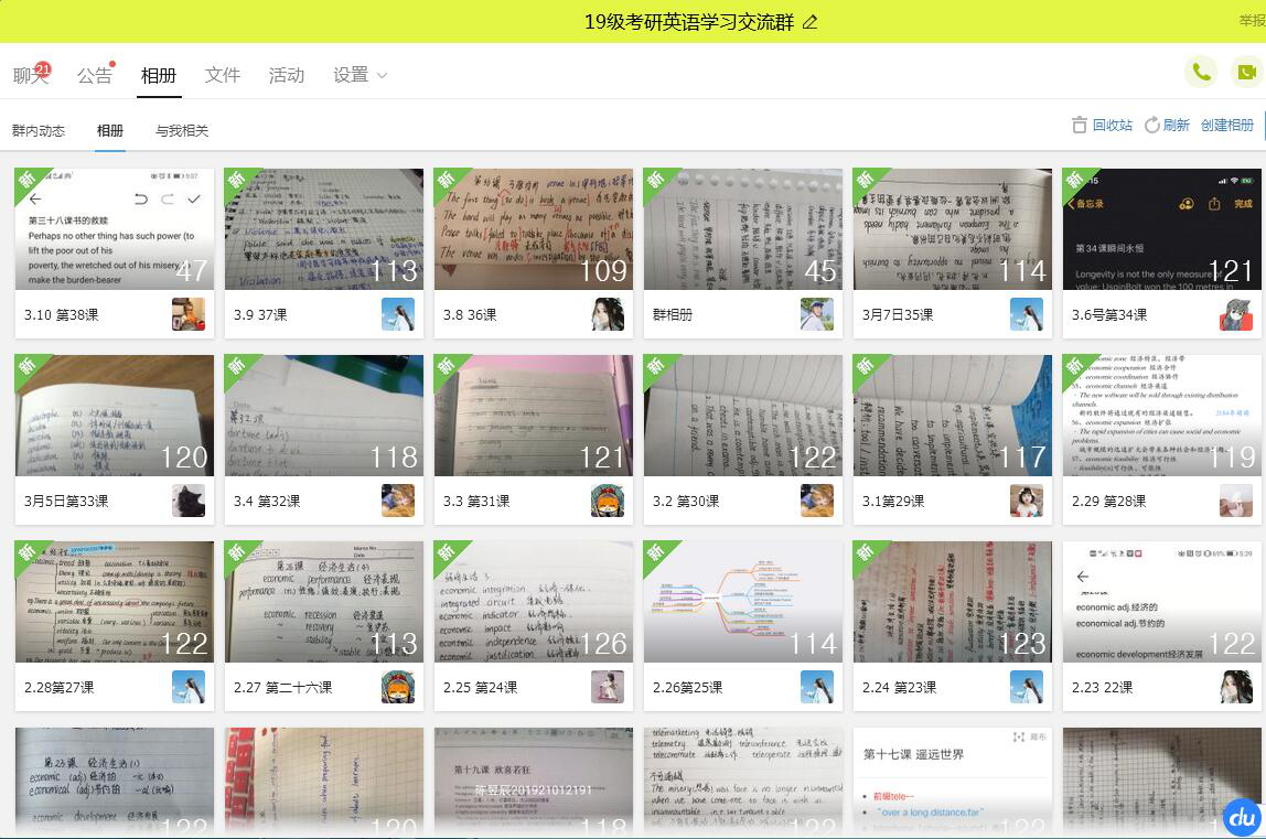 同學們用對武漢的祝福話語“打卡”接力。 學風建設“實”發(fā)力 同學們在網上開課近一個月了,為了響應“停課不停學”的號召,身處祖國大江南北的2019級同學們通過各種APP進行線上學習。自2月份起,學院提供的考研英語學習渠道,創(chuàng)建了考研英語學習交流QQ群,同時有七位同學自愿報名負責協助英語打卡相關的工作,截至目前,每位同學都能認真學習,積極打卡學習,群內的打卡活動仍在進行。實際上,自2019年7月開始,全年級同學們已經自發(fā)在年級微信群開始英語打卡學習。據初步統計,2019級有近48%的學生已通過2019年12月四級考試。同時,各班根據本班情況也制定學風建設方案。自3月份起,同學們采用各種形式積極打卡每天的學習成果。