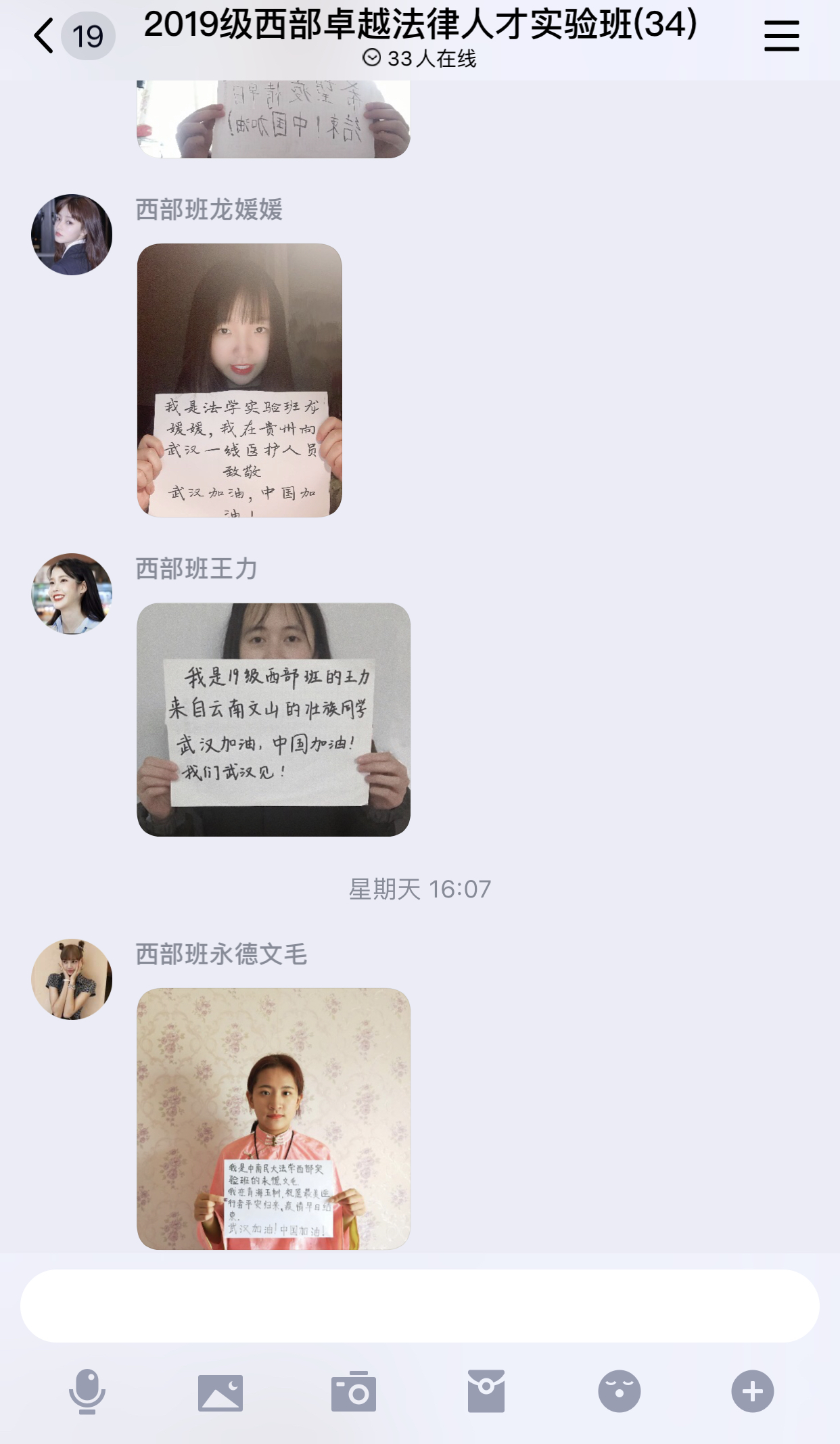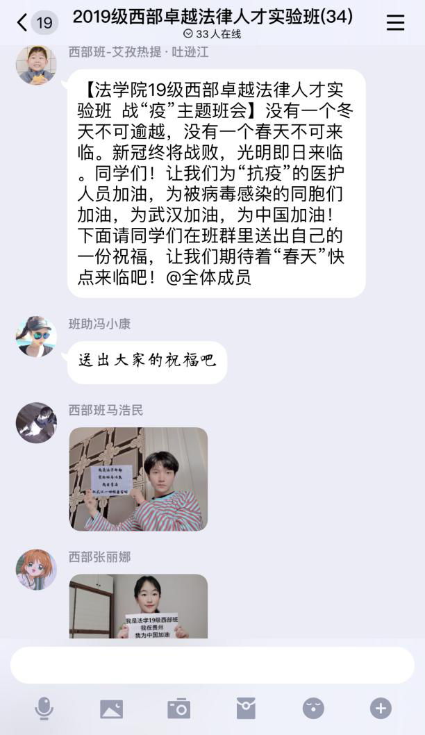 家校互動相關工作記錄。 線上班會“深”入心 為了引導學生正確認識疫情,科學了解疫情,遵守紀律,承擔防疫責任,履行防疫義務,增強責任感、使命感,瑪依拉老師組織各班級圍繞愛國主義教育、生命教育、感恩教育,開展網絡主題班會,將網絡班會打造成特殊時期學生德育新陣地,發(fā)揮網絡班會的良好效果。法學1903班、法學1906班普及關于疫情防控知識,讓同學們了解到了疾病的傳播途徑以及疫情防護的相關知識,充分認識到自我保護的重要性。法學1904班、1907班分別以“凝聚青春正能量,團結一心抗疫情”“同心抗疫、共克艱時”為主題,在班會中號召同學們手寫接力,把自己為武漢加油的圖畫或視頻上傳至班群進行分享交流,送出同學們對武漢的祝福。法學1905班、1908班在分享感人故事和精彩瞬間,組織學習身邊感人肺腑的抗疫先進人物事跡,使同學們增強勇于肩負起時代賦予的使命與責任。法學2019級西部法律人才卓越實驗班邀請到校級“百生講壇”活力團總支法學2017級西部法律人才卓越實驗班做先進班集體分享,班會中輔導員、班主任瑪依拉老師,陳光斌老師與同學們積極互動,同學們紛紛表示要加倍努力學習,延遲開學期間一定全力以赴提高自己,精心沉淀,厚積薄發(fā)!通過這次特殊的網絡班會,同學們心底里都多了一份堅毅,也增添了一份勇氣。