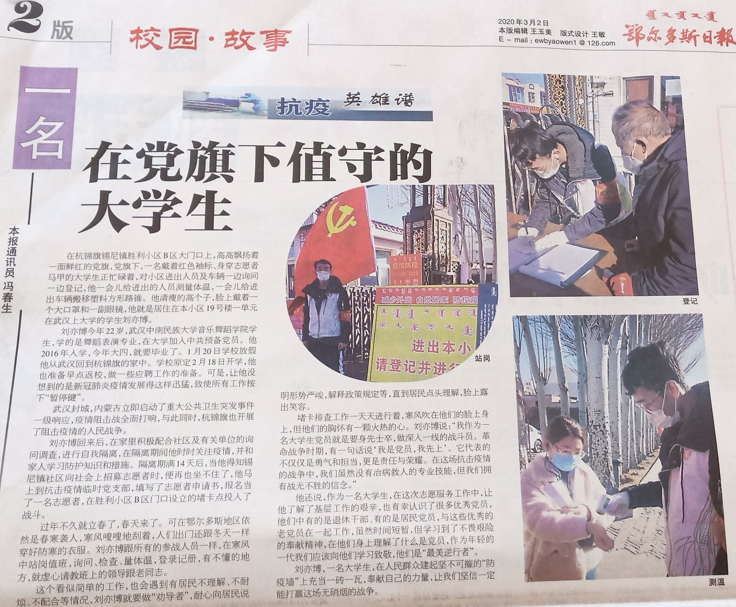 3月2日,鄂爾多斯日報“抗疫英雄譜”專欄以“一名在黨旗下值守的大學生”為題報道了我校音樂舞蹈學院學生劉亦博在抗擊疫情一線的事跡。