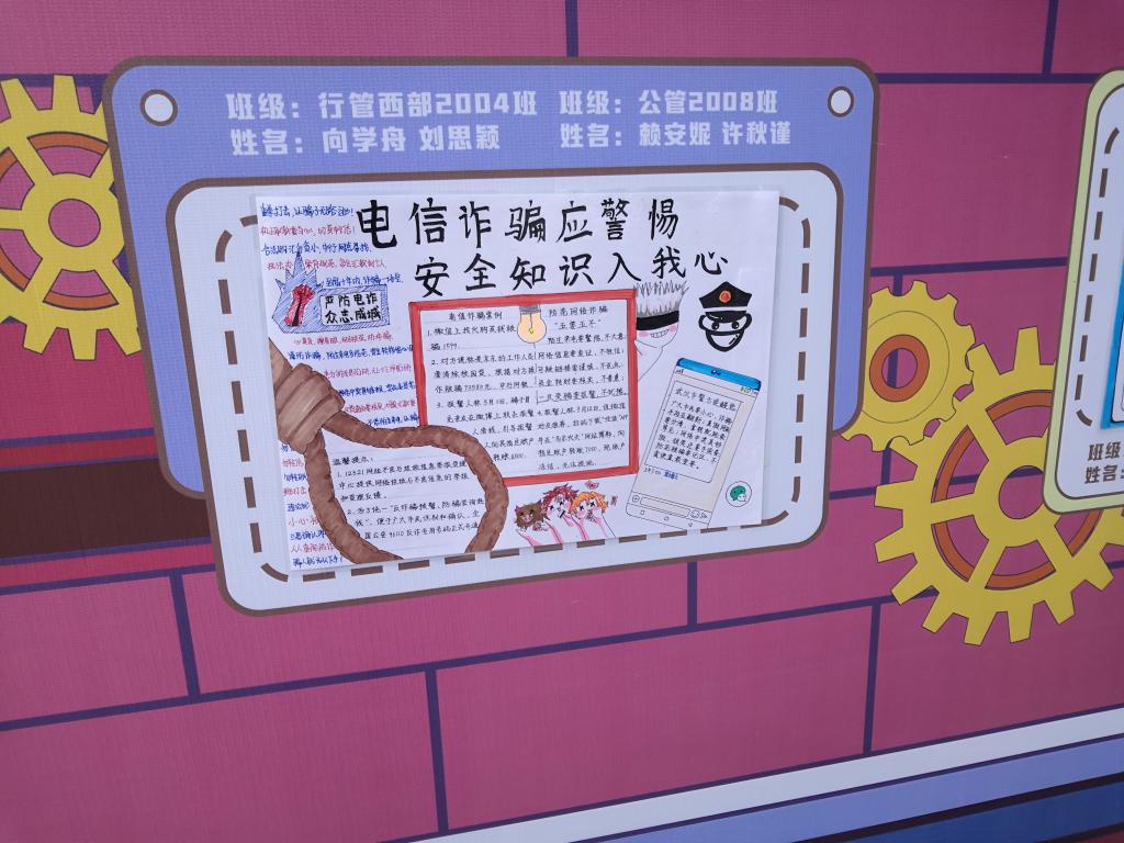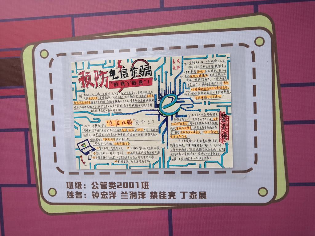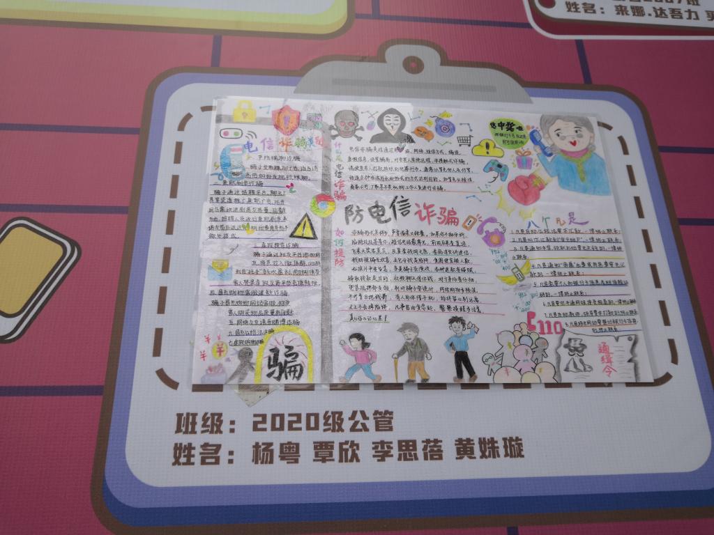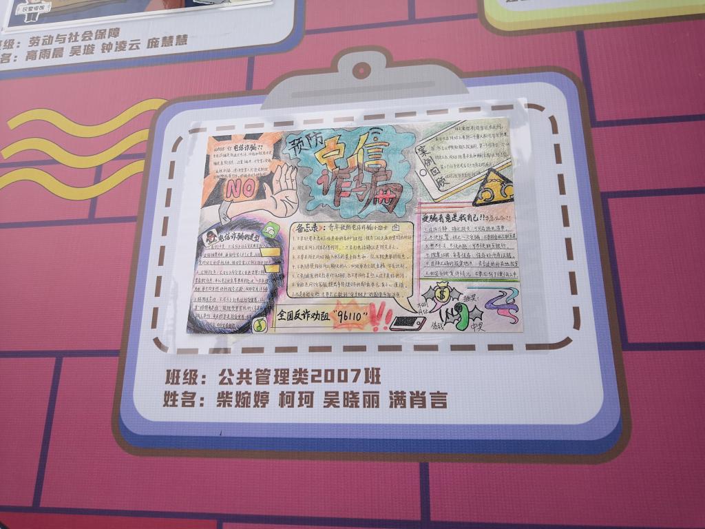 為了深入開(kāi)展預(yù)防電信詐騙宣傳教育活動(dòng),切實(shí)維護(hù)學(xué)生合法權(quán)益,公共管理學(xué)院舉行了預(yù)防電信詐騙手抄報(bào)比賽,同學(xué)們積極參與,最終有30多個(gè)作品脫穎而出。同學(xué)們的作品都別具特色,充分體現(xiàn)著廣大同學(xué)的個(gè)性和智慧,評(píng)審工作結(jié)束以后,所有作品都集中進(jìn)行展示,目前在15號(hào)教學(xué)樓下,吸引了許多師生駐足觀看,同學(xué)們紛紛表示這種形式很吸引人,同時(shí)也很有創(chuàng)意,加深了自己對(duì)預(yù)防電信詐騙活動(dòng)的理解。