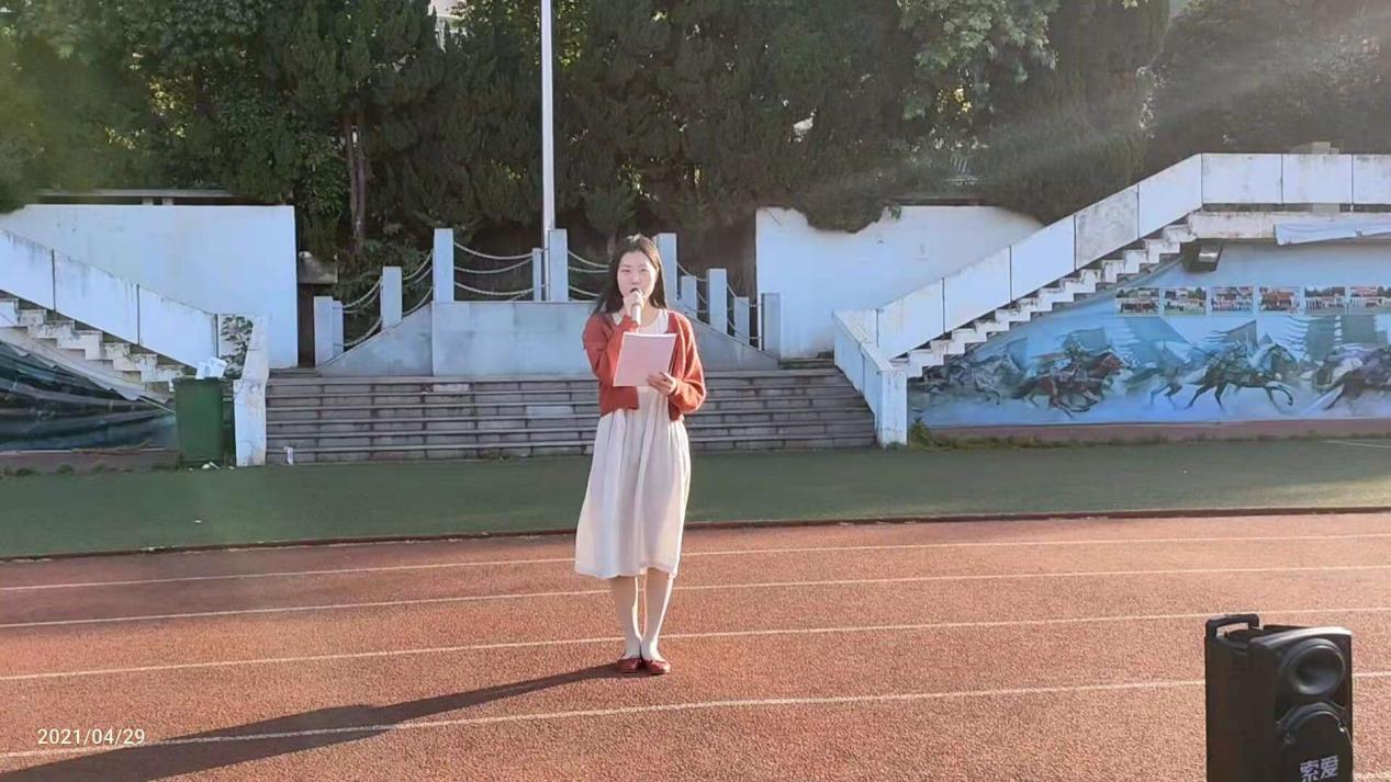 當歌聲響起的那一刻,五星紅旗隨風(fēng)飄揚,在這萬物復(fù)蘇的季節(jié),成為更明媚的風(fēng)景。4月29日7時25分升旗儀式正式謝幕后,由2004班魏云簫作旗下演講。魏云簫以建黨一百年的契機為出發(fā)點,帶領(lǐng)大家回顧中國共產(chǎn)黨建黨以來的光輝歷程,領(lǐng)略紅船精神。她呼吁大家要厚植愛國情懷,堅定理想信念,不忘初心,爭當時代新人。