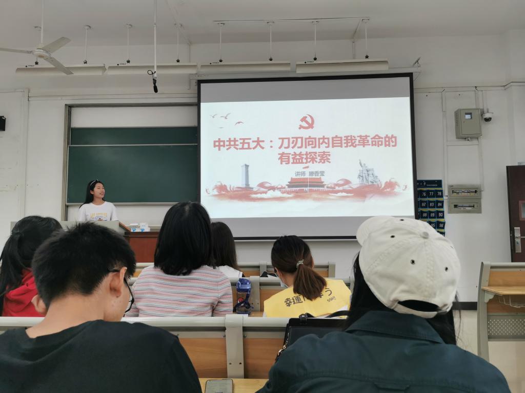 宣講會上,主講人圍繞學習雷鋒精神凝聚精神力量、認識中共五大學習革命精神、牢記初心使命永葆奮斗精神等方面作了深入全面的闡釋。主講人表示,青年學生學習雷鋒精神,主要是加強道德的自我建設,關心社會,心系國家,遵守公共秩序,遵守法治體系,在服務人民、奉獻社會的實踐中創造人生價值、實現人生理想。中共五大提出了爭取無產階級對革命的領導權、建立革命民主政權和實行土地革命等目標,在黨的發展史上作出了重要的貢獻,青年人要以黨史為鑒,以自我革命的精神與勇氣,銘記初心,不斷自我完善、自我革新、自我提高,始終堅持不忘初心、牢記使命,增強“四個意識”,堅定“四個自信”,做到“兩個維護”,把個人理想自覺融入國家發展偉業,勇于擔當民族復興大任,在祖國最需要的地方建功立業,不負人民期望,不辱時代使命,為實現“兩個一百年”奮斗目標、實現中華民族偉大復興的中國夢貢獻智慧和力量。